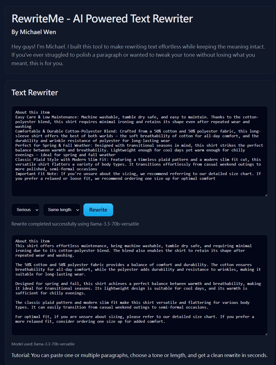 Rewriteme - AI Powered Text Rewriter App by Michael Wen